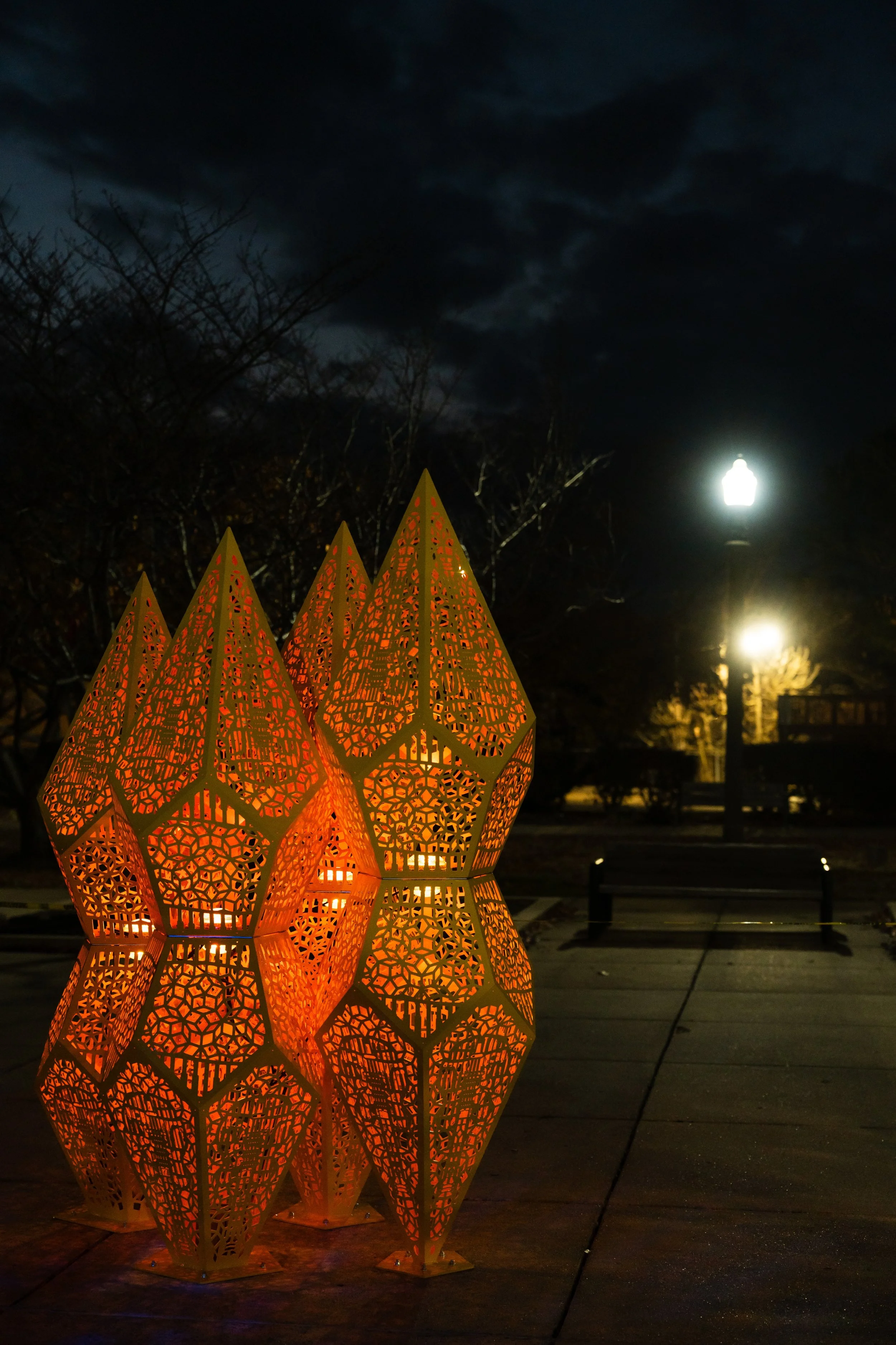 In addition to the shapes of tables and chairs and the interior sculpture, each piece has lighting inside, creating lanterns in the dark. The lighting is completely customizable depending on the season, or even with the beat of the music at an AMP show.
