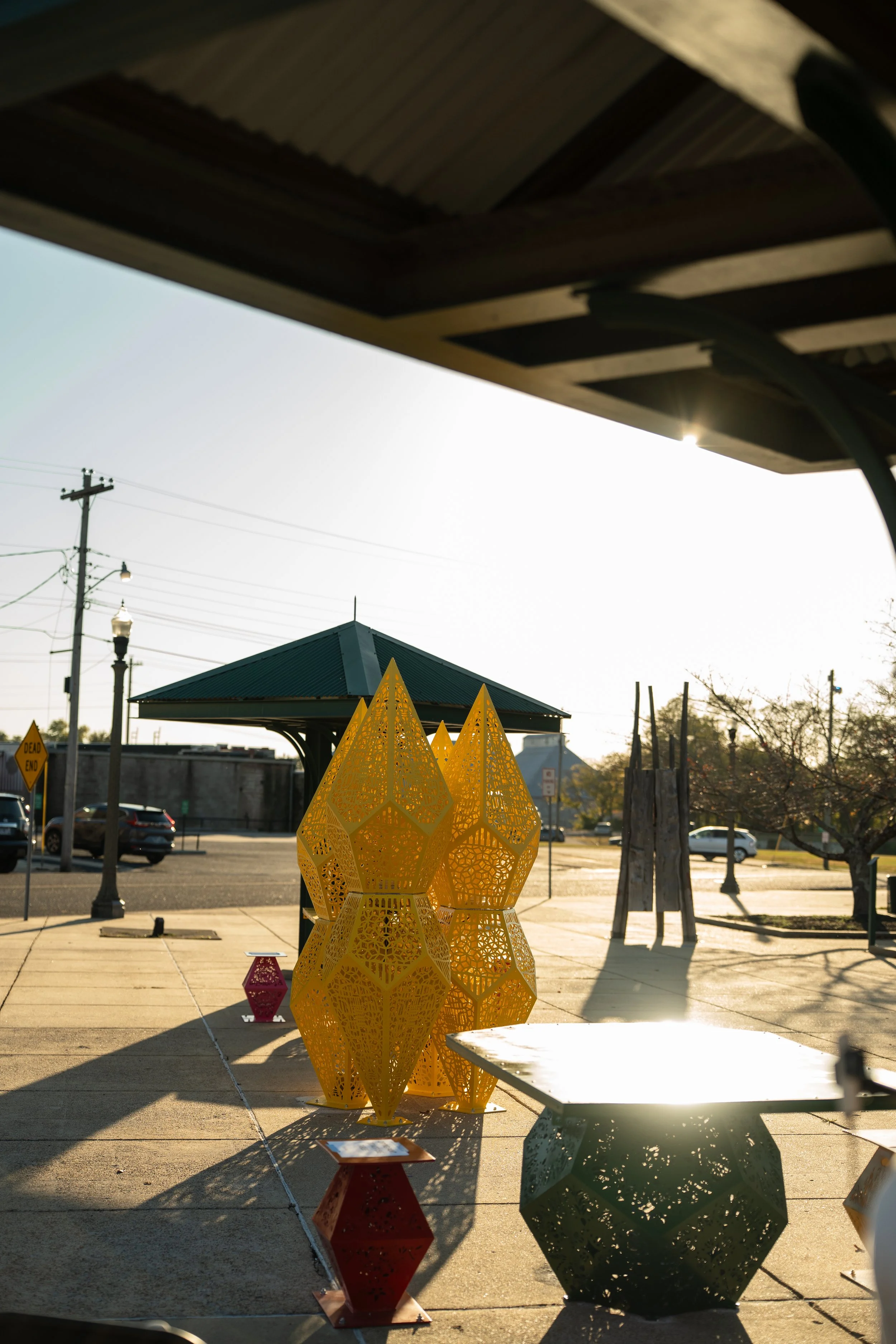 When the team from Looking Up Arts began dreaming up the design, they started not with their own ideas, but with Jackson’s. They studied the geometry and shape of the park’s existing green awnings, using those forms as the foundation for their structure. From there, they researched the local culture and history, wanting to know the stories that define the city.