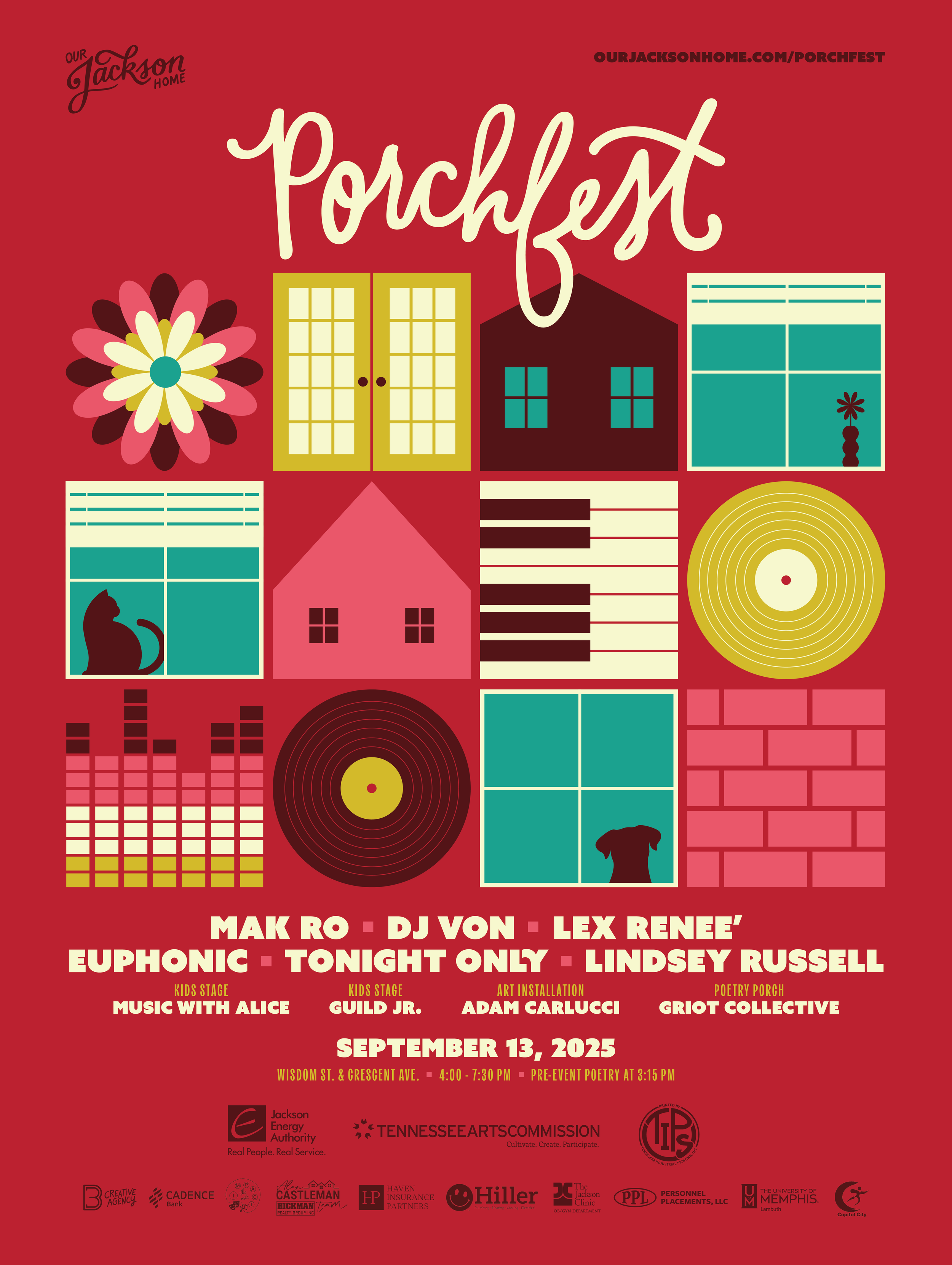 This year features six performing artists showcasing the best of West Tennessee music across a variety of genres, presented by Jackson Energy Authority with stages sponsored by 6 local businesses. This year features a visual art installation by Adam Carlucci to create a vibrant atmosphere, plus a kids stage and a pre-event poetry porch.