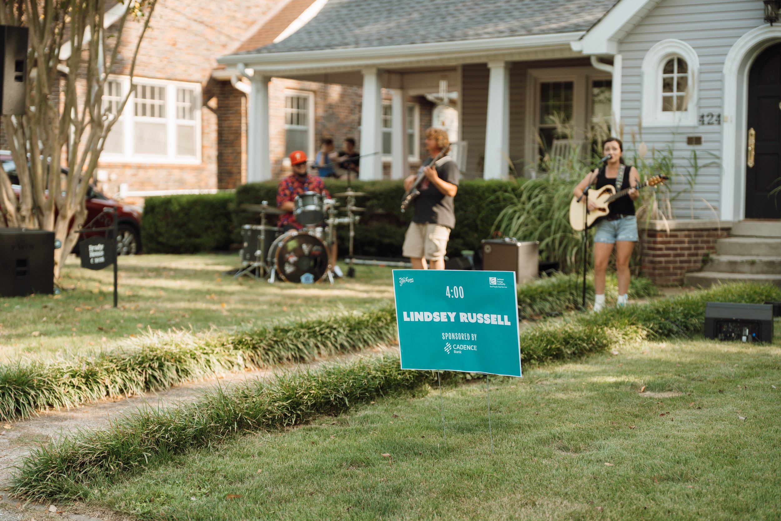 Event Recognition: Logo on the official Porchfest poster and on a sign at the musician’s stage at the event.
